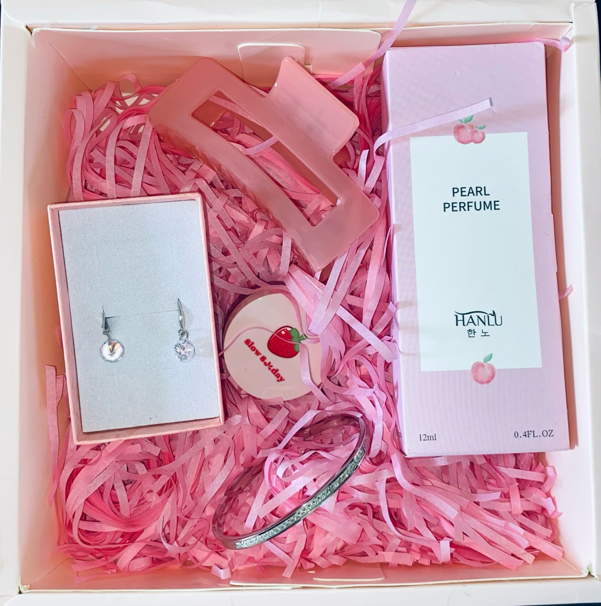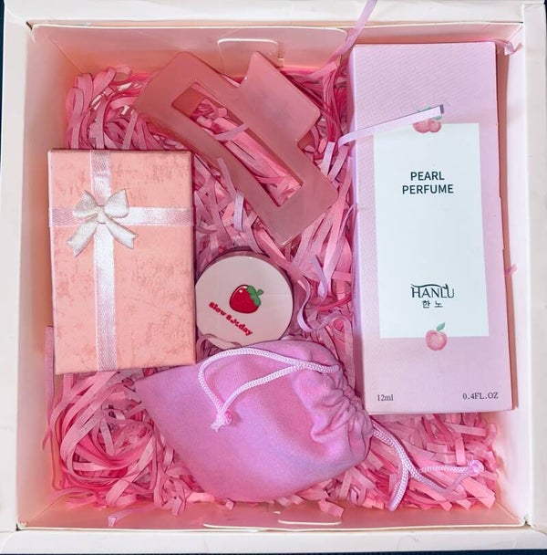 zit een haarklem in, lipbalsem, parfum,armband en oorbellen.